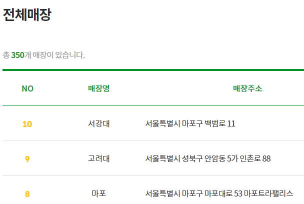 보면 2019년 6월 현재 350개의 매장이 존재하며 매장명과 매장주소를 같이 제공하고 있다. 페이지가 넘어가며 url이 바뀌는 편한 구조이기 때문에 크롤링은 쉽다. 머리를 잘 써서 page_number를 지정해주지 않아도 알아서 크롤링 해오게 할 수 있지만 무난하게 페이지를 지정해주었다.