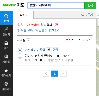 5. 강원도에는 서브웨이가 하나도 없는걸로 나타나는데 정말 없을까? 확인해본다.
