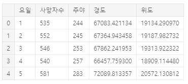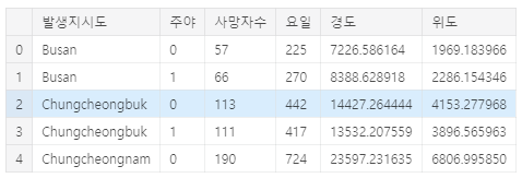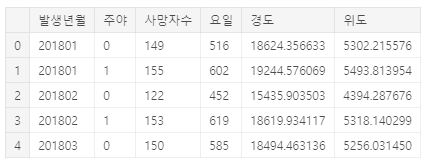 df = df[['발생년월일시','사망자수','주야','요일','발생지시도','발생지시군구','경도','위도']]