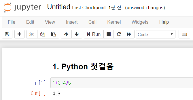 New를 통해 새로운 노트북을 생성하고 Markdown 셀로 원하는 제목을 정해준다. 1 line씩 실행할 수 있으며 In을 통해 코드를 입력하고 Out을 통해 결과를 보여준다. 얘는 리눅스의 명령어를 모두 수용해주는 착한 모습을 보인다.