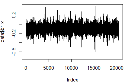 plot(b1[, 12], ylab="BPFI density",xlab="Index", main="B1 BPFI x axis", t="l")