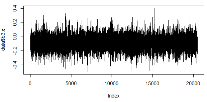 plot(b3[, 12], ylab="BPFI density",xlab="Index", main="B3 BPFI x axis", t="l")