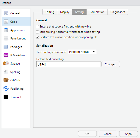tool > global options > codes > saving