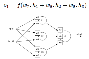 언제나 출력값이 0에서 1 사이인 것을 볼 수 있다. 그렇기 때문에 output neuron은 항상 0에서 1사이의 값을 도출해낸다. 이 정보를 통해 output neuron에서 나오는 값의 결과를 계산할 수 있다. 임의의 neuron o1을 살펴보자.