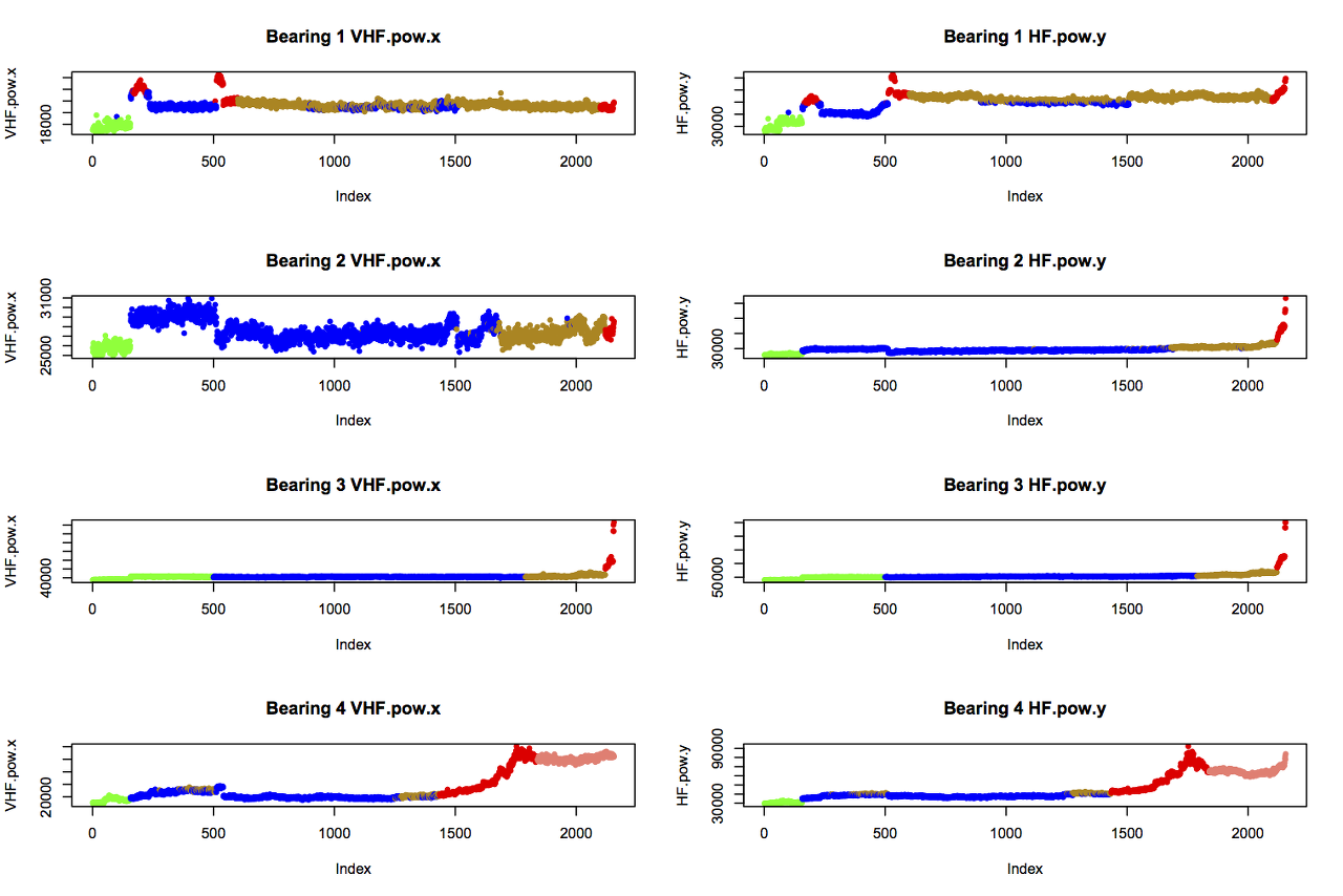plot(best.kmeans$cluster[s:e], col=cols[s:e], ylim=c(1,k), main=paste0("Bearing ", i), ylab="Cluster")
